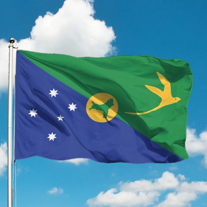Флаг Острова Рождества состоит из зелёного, синего и белого цветов, которые представляют тропическую природу, небо и море острова. На синем поле расположена белая пятиконечная звезда, символизирующая рождественскую звезду, в честь которой назван остров. В верхнем левом углу расположен британский Юнион Джек, символизирующий историческую связь О..