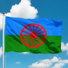 Флажок цыган который был принят в 1971 году на Первом всемирном цыганском конгрессе в Лондоне, имеет символический дизайн, отражающий историю и культуру этого народа. Флаг состоит из двух горизонтальных полос: верхней синей и нижней зелёной. В центре флага находится красное колесо с шестнадцатью спицами, известное как "чакра".